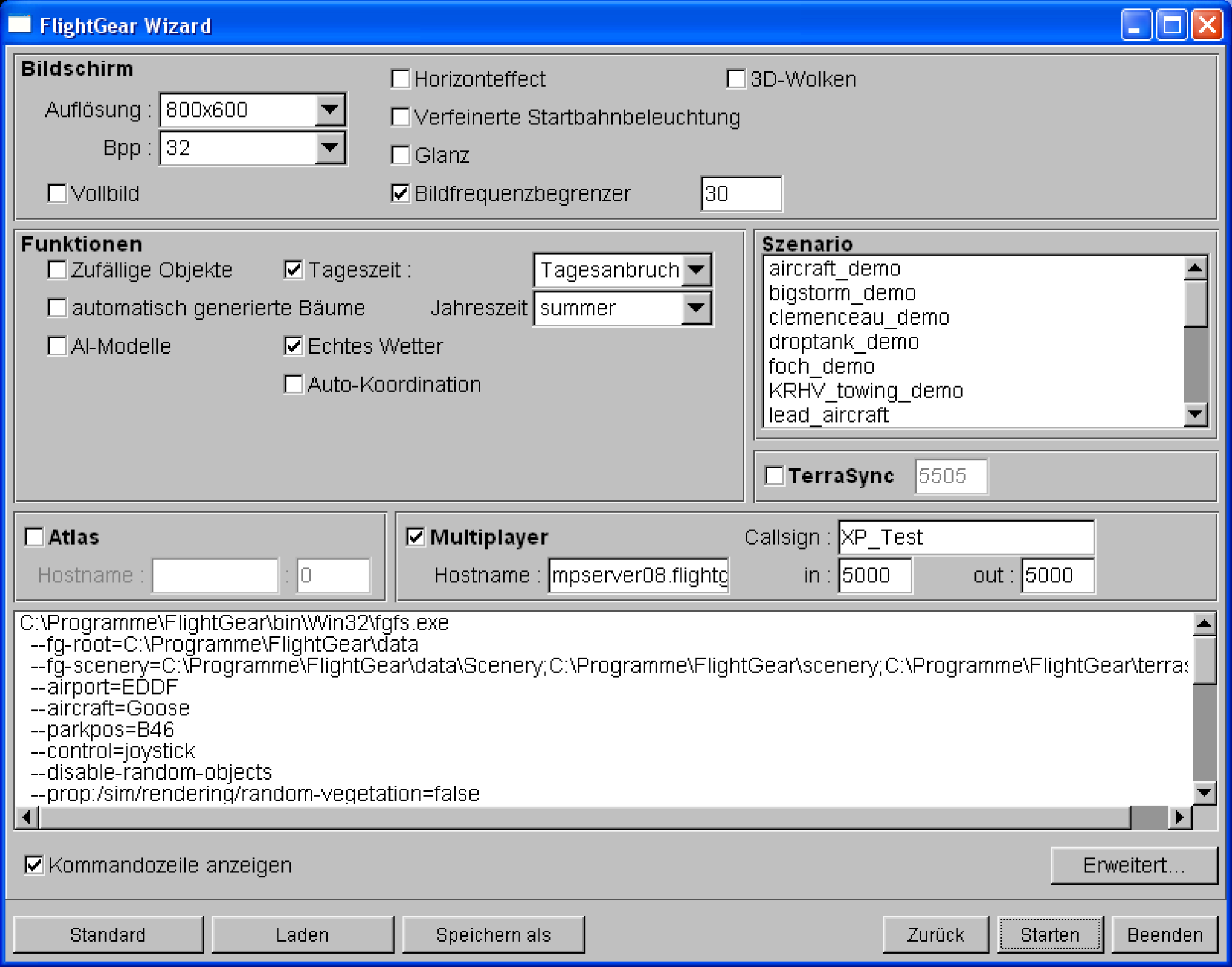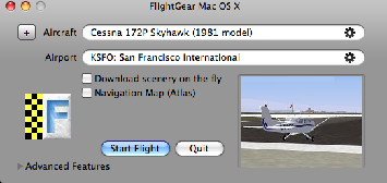 Kapitel 1. Starten des FlightGear Simulators erläutert wie das installierte Programm gestartet wird. Es erläutert weiterhin die gängigsten Optionen zu dem Startbefehl und zusätzlicher Konfigurationsdateien.